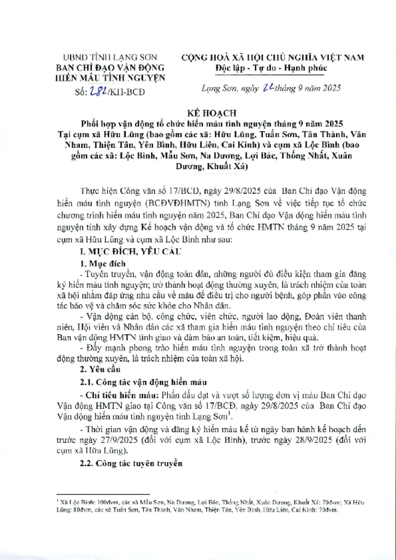 Tiêu đề văn bản | Kế hoạch phối hợp vận động tổ chức hiến máu tình nguyện tháng 9 năm 2025 tại cụm xã Hữu Lũng (gồm các xã: Hữu Lũng, Tuấn Sơn, Tân Thành, Cai Kinh, Yên Bình, Vân Nham, Thiện Tân, Hữu Liên) | ||
