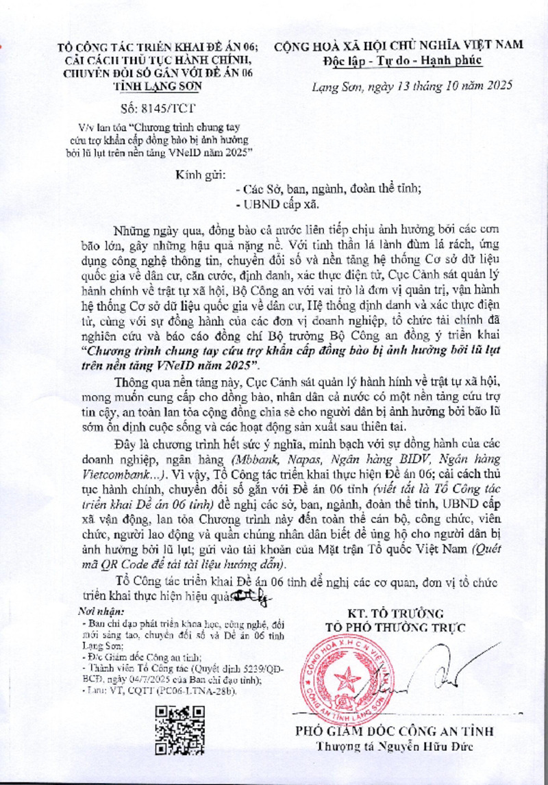 Tiêu đề văn bản | Lan tỏa "chương trình chung tay cứu trợ khẩn cấp đồng bào bị ảnh hưởng lũ lụt trên VNeID" | ||