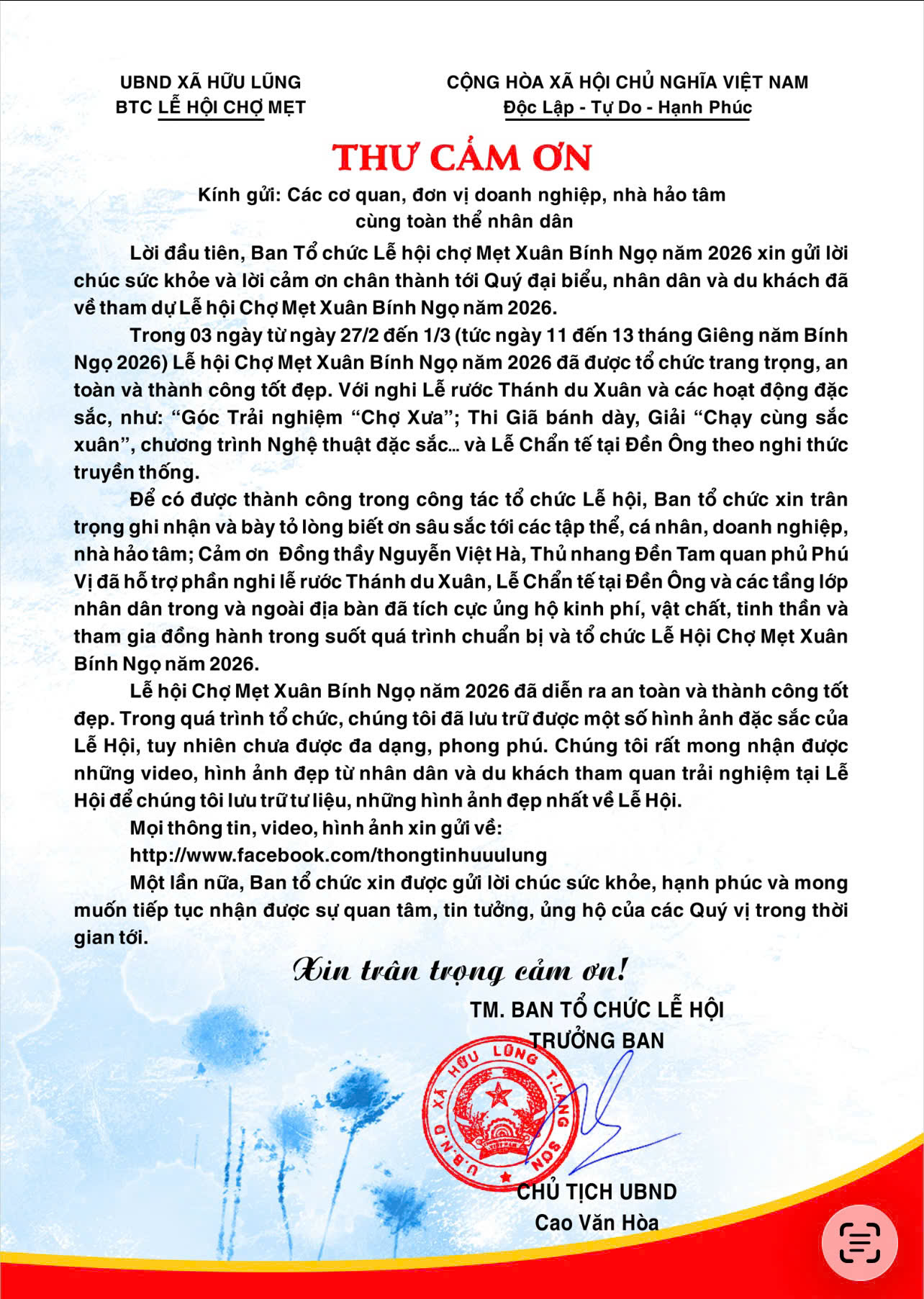Thư Cảm ơn - Lễ Hội Chợ Mẹt Xuân Bính Ngọ năm 2026
