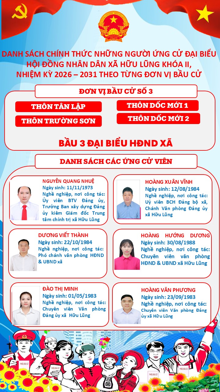 Ứng cử viên Đại biểu HĐND xã Hữu Lũng khoá II, nhiệm kỳ 2026-2031 - Đơn vị Bầu cử số 3
