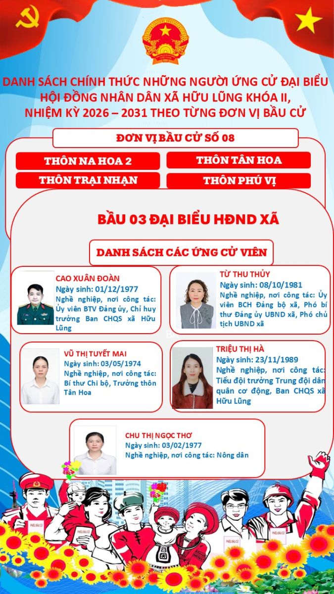 Ứng cử viên Đại biểu HĐND xã Hữu Lũng khoá II, nhiệm kỳ 2026-2031 - Đơn vị Bầu cử số 8