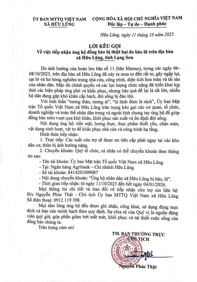 Lời kêu gọi về việc tiếp nhận ủng hộ đồng bào bị thiệt hại do bảo lũ trên địa bàn xã Hữu Lũng, tỉnh Lạng Sơn