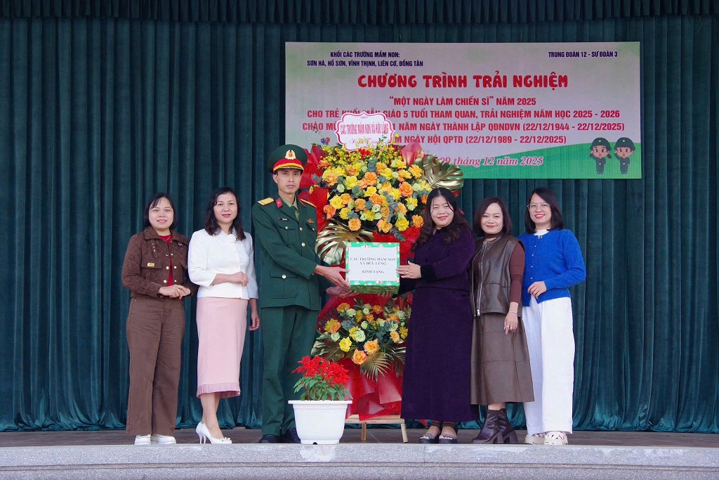 Sáng ngày 09/12/2025, Khối các Trường Mầm non: Sơn Hà , Đồng Tân, Liên Cơ, Vĩnh Thịnh, Hồ Sơn đã tổ chức cho 416 các bé khối 5 tuổi cùng 70 Cán bộ giáo viên, phụ huynh các trường tham quan và trải nghiệm tại Trung đoàn 12 thuộc Sư đoàn 3 - Quân khu I. Dự chỉ đạo hoạt động trải nghiệm có đồng chí Trung tá Trần Văn Sửu – UVBTV- Phó Trung đoàn trưởng - Tham mưu trưởng Trung đoàn. Với sự chuẩn bị chu đáo của nhà trường và sự đón tiếp nhiệt tình của thủ trưởng, cán bộ, chiến sĩ, buổi trải nghiệm với chủ đề “ Một ngày làm chiến sĩ” đã diễn ra an toàn, vui tươi và đầy ý nghĩa.