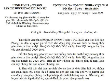 Thực hiện văn bản số 1088/BCH-SNNMT ngày 12/03/2026 của Ban Chỉ đạo Phòng thủ dân sự tỉnh Lạng Sơn về việc chủ động ứng phó với thiên tai trong thời gian diễn ra bầu cử đại biểu Quốc hội khóa XVI và ...