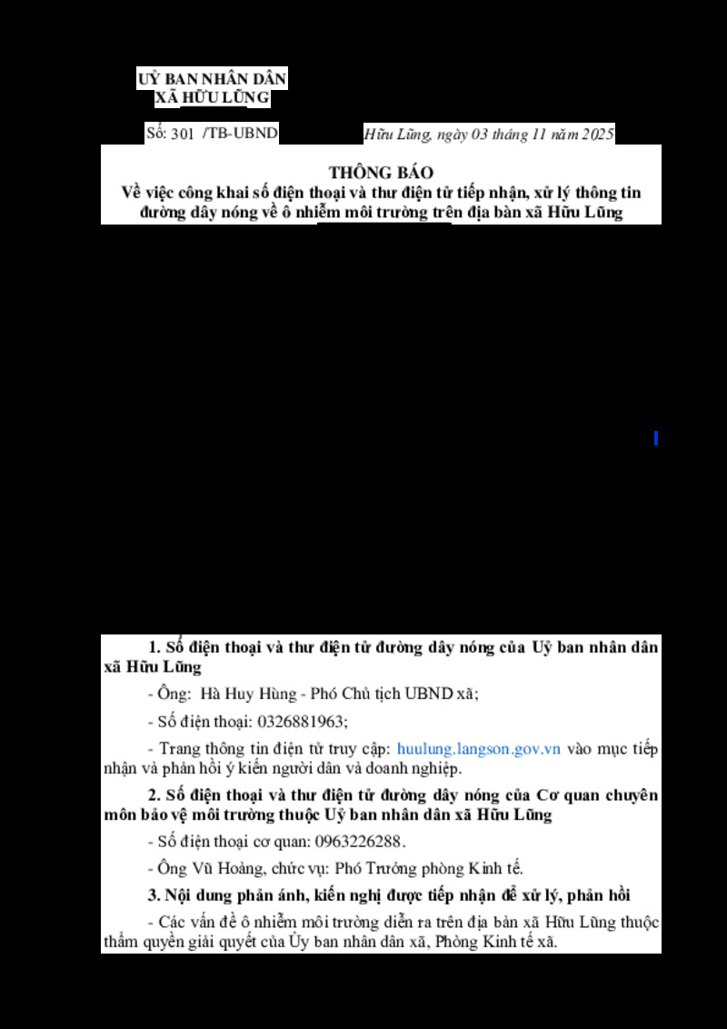 | Tiêu đề văn bản | TB Về việc công khai số điện thoại và thư điện tử tiếp nhận, xử lý thông tin đường dây nóng về ô nhiễm môi trường | ||