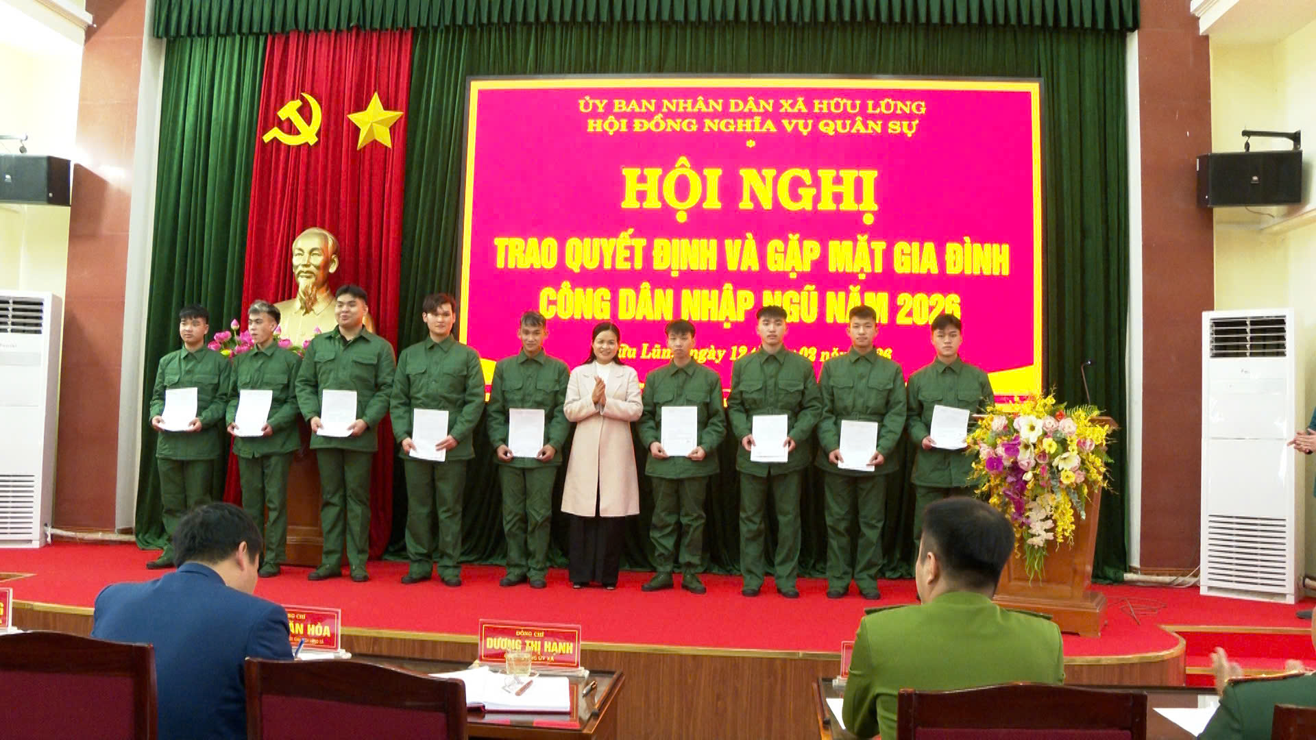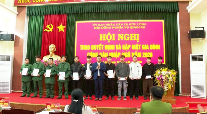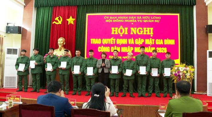 Chiều ngày 12/2, Hội đồng nghĩa vụ quân sự xã Hữu Lũng tổ chức Hội nghị trao quyết định và gặp mặt gia đình, công dân nhập ngũ năm 2026. Dự hội nghị có các đồng chí lãnh đạo Đảng uỷ, HĐND, UBND, UBMTTQ xã; các thành viên Hội đồng Nghĩa vụ quân sự xã; đại diện lãnh đạo các ban, ngành, đoàn thể; các công dân nhập ngũ và đại diện các gia đình có công dân nhập ngũ năm 2026.