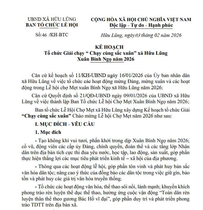 Kế hoạch Tổ chức Giải chạy “ Chạy cùng sắc xuân” xã Hữu Lũng Xuân Bính Ngọ năm 2026