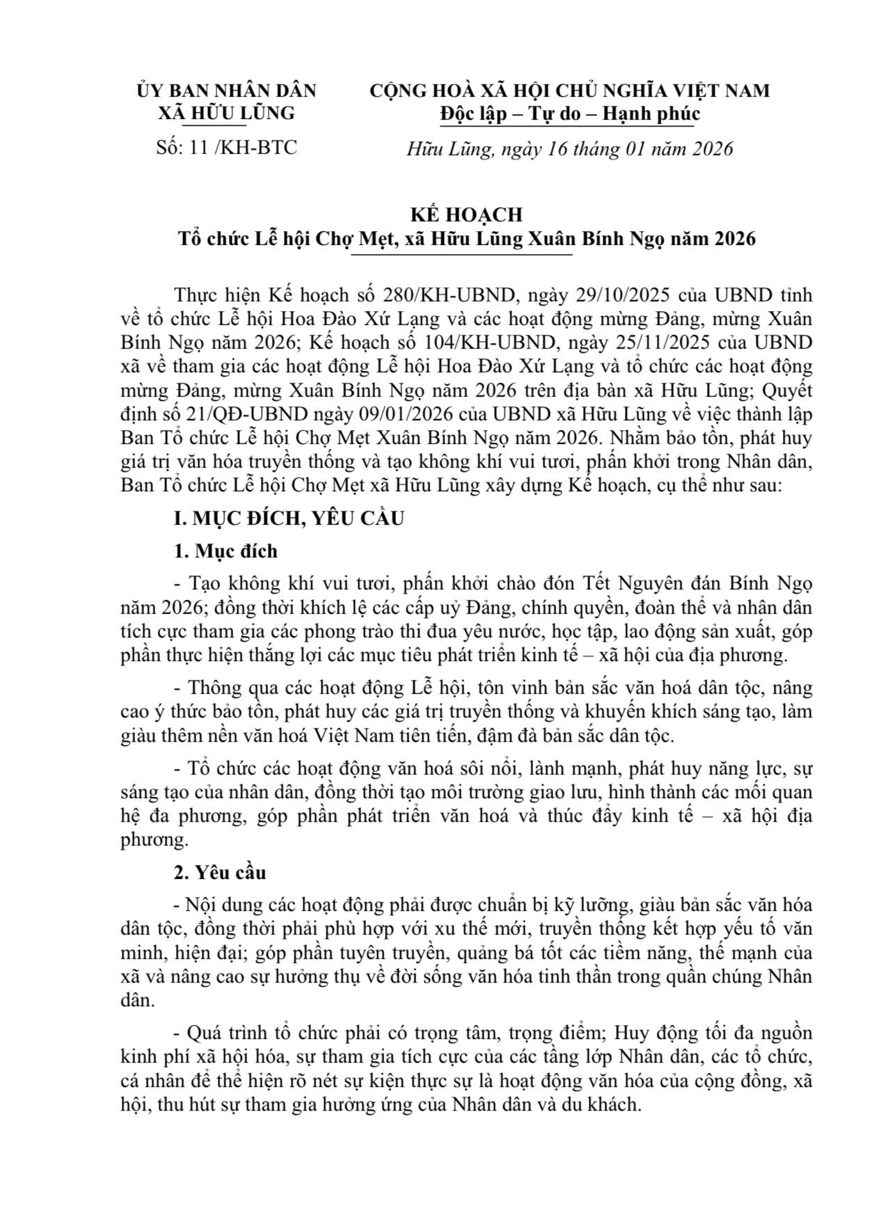 Thực hiện Kế hoạch số 280/KH-UBND, ngày 29/10/2025 của UBND tỉnh về tổ chức Lễ hội Hoa Đào Xứ Lạng và các hoạt động mừng Đảng, mừng Xuân Bính Ngọ năm 2026; Kế hoạch số 104/KH-UBND, ngày 25/11/2025 của UBND xã về tham gia các hoạt động Lễ hội Hoa Đào Xứ Lạng và tổ chức các hoạt động mừng Đảng, mừng Xuân Bính Ngọ năm 2026 trên địa bàn xã Hữu Lũng; Quyết định số 21/QĐ-UBND ngày 09/01/2026 của UBND xã Hữu Lũng về việc thành lập Ban Tổ chức Lễ hội Chợ Mẹt Xuân Bính Ngọ năm 2026. Nhằm bảo tồn, phát huy giá trị văn hóa truyền thống và tạo không khí vui tươi, phấn khởi trong Nhân dân, Ban Tổ chức Lễ hội Chợ Mẹt xã Hữu Lũng xây dựng Kế hoạch, cụ thể như sau: