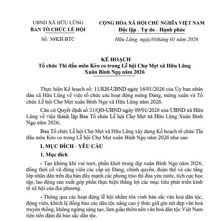 Trên đây là Kế hoạch tổ chức Thi đấu môn kéo co trong Lễ hội Chợ Mẹt xuân Bính Ngọ xã Hữu Lũng năm 2026. Đề nghị các đơn vị phối hợp và các đơn vị trực thuộc UBND xã Hữu Lũng thực hiện./.