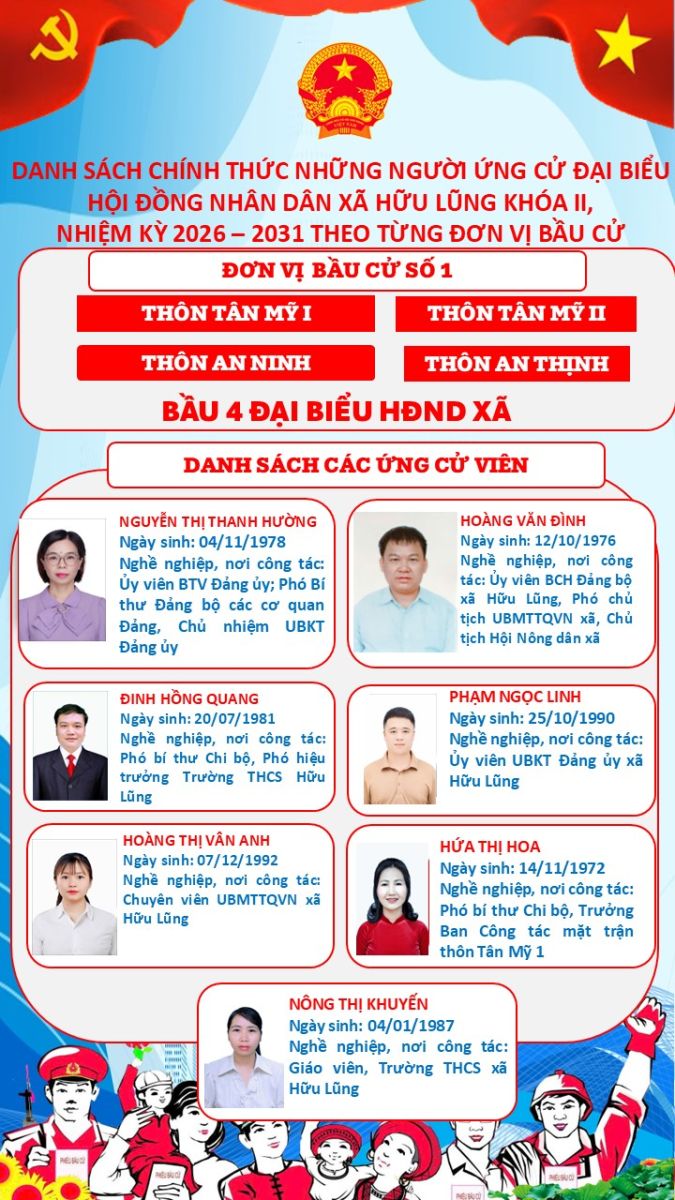 Ứng cử viên Đại biểu HĐND xã Hữu Lũng khoá II, nhiệm kỳ 2026-2031 - Đơn vị Bầu cử số 1