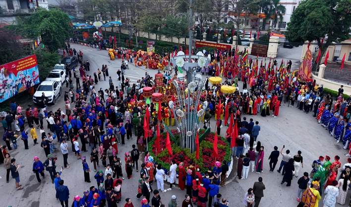 Ngay từ sáng sớm, nghi lễ rước Thánh du xuân được tổ chức theo nghi thức truyền thống, xuất phát từ Đền Ông, đi qua các trục đường chính của địa phương. Trong tiếng trống chiêng rộn ràng, đoàn rước cùng đông đảo Nhân dân thành kính cầu quốc thái dân an, mưa thuận gió hòa, mùa màng tốt tươi, mở đầu mùa lễ hội trong không khí trang nghiêm, linh