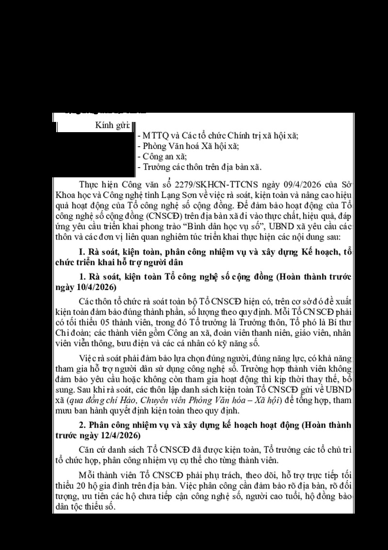 | Tiêu đề văn bản | V/v triển khai rà soát, kiện toàn và nâng cao hiệu quả hoạt động Tổ công nghệ số cộng đồng trên địa bàn xã Hữu Lũng | ||