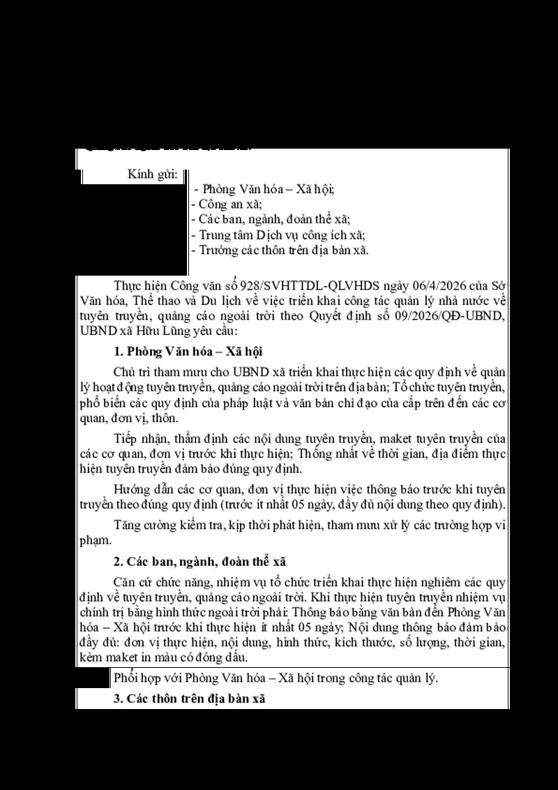 | Tiêu đề văn bản | V/v triển khai thực hiện công tác quản lý nhà nước về tuyên truyền, quảng cáo ngoài trời trên địa bàn xã Hữu Lũng | ||