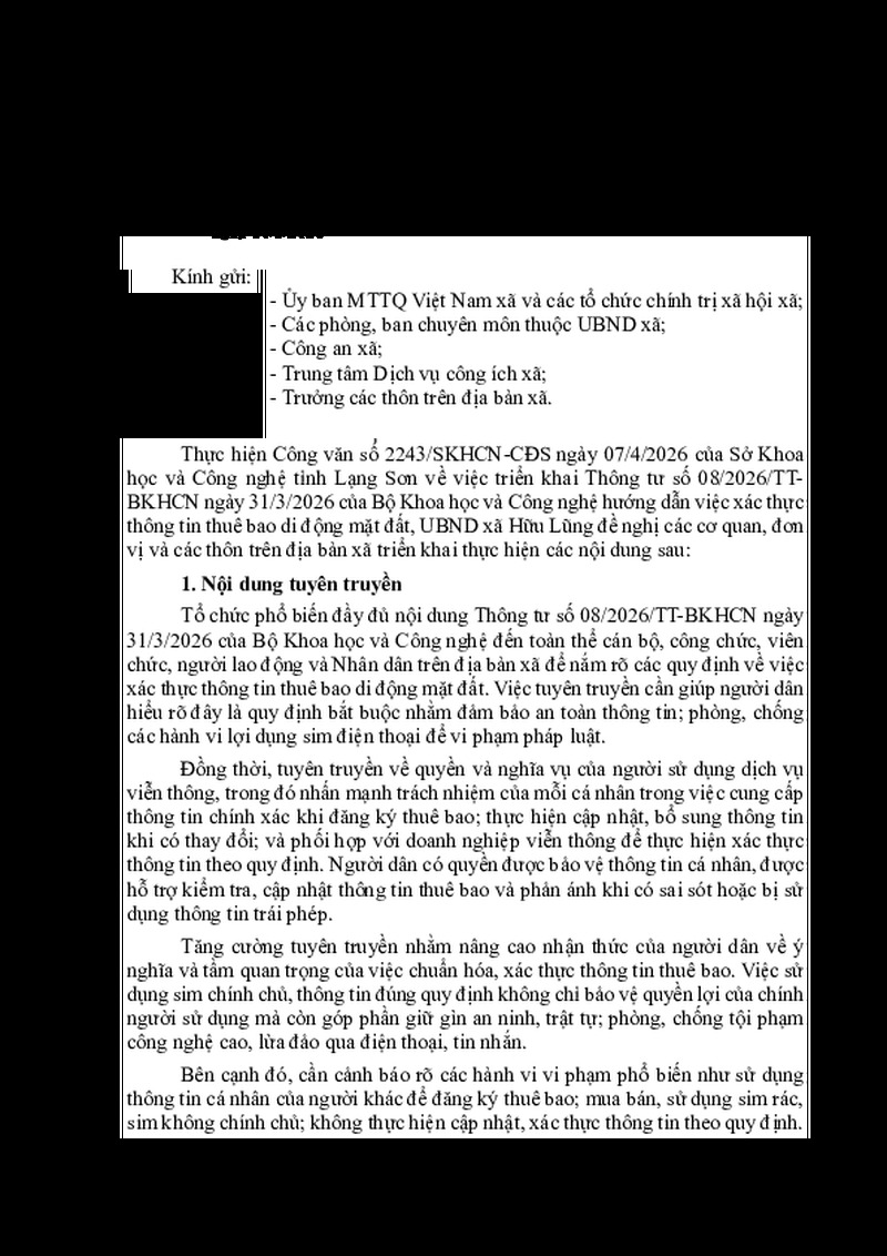 | Tiêu đề văn bản | V/v tuyên truyền, phổ biến Thông tư số 08/2026/TT-BKHCN ngày 31/3/2026 xã Hữu Lũng | ||